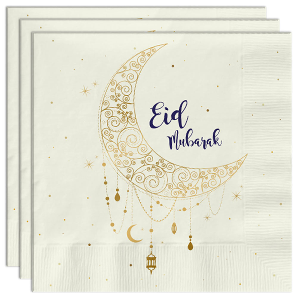 Eid Mubarak Servetter omfattar 20 stycken vita pappersservetter med ett detaljerat motiv av en månskära, stjärnor och prickar samt blå "Eid Mubarak" text.