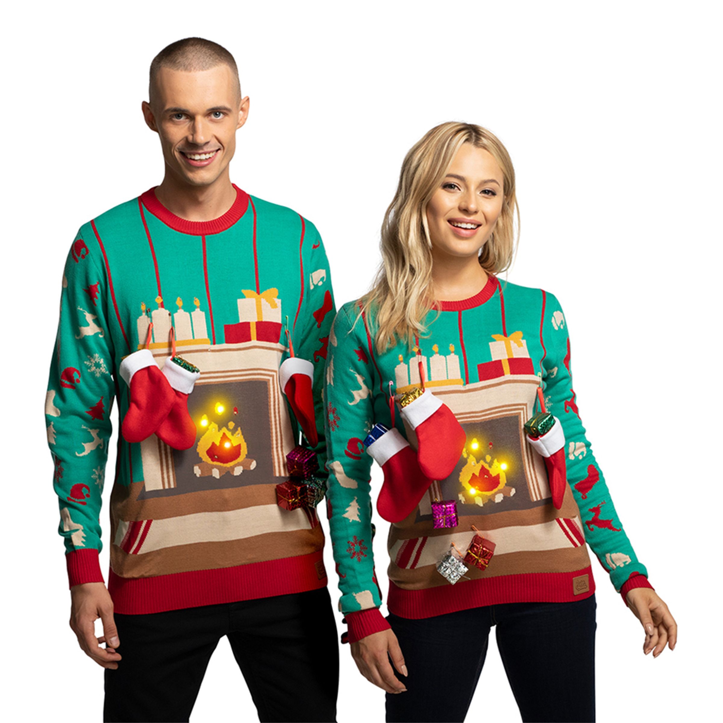Eldstad LED Jultröja är mysig jultröja med motiv av en brinnande brasa och med ett gäng julstrumpor som hänger på tröjan. Tröjan kommer i en hel drös olika storlekar och passar både henne och honom. Tröjan är tillverkad i ett finstickat akrylmaterial och passar lika bra att bära på julafton som till julfesten med jobbet eller kompisarna. På jultröjan finns flertalet LED-lampor som blinkar och lyser i olika färger. Lamporna drivs av 2 x CR2032-batterier som ej medföljer, men som kan köpas till.