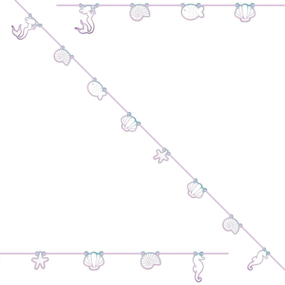 Elegant Mermaid Girlang består av en vacker girlang i blått och rosa med vita motiv av sjöjungfrur, snäckor, fiskar och sjöhästar. Motiven sitter fast på ett snyggt rosa band. Tillverkad i papp.