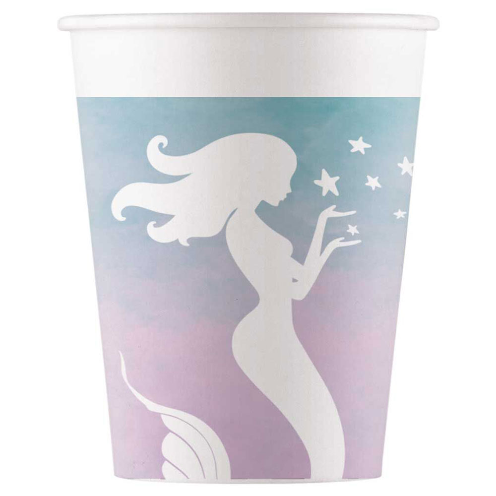 Elegant Mermaid Muggar omfattar 8 stycken vita engångsmuggar med motiv av en vit sjöjungfru, fiskar, snäckor och sjöstjärnor mot en blå-rosa bakgrund. Tillverkade av papp.