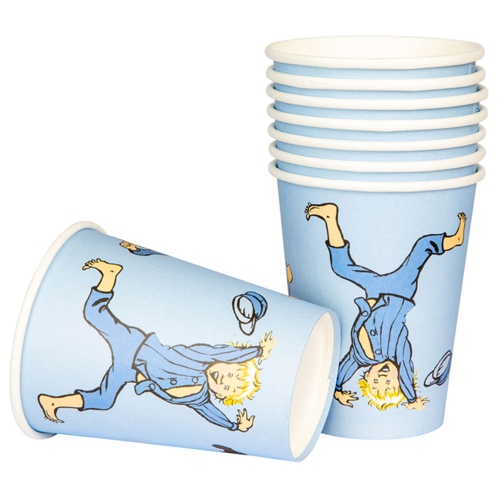 Emil i Lönneberga Engångsmuggar 8-pack består av åtta engångsmuggar med Emil i Lönneberga motiv mot en ljusblå bakgrund.