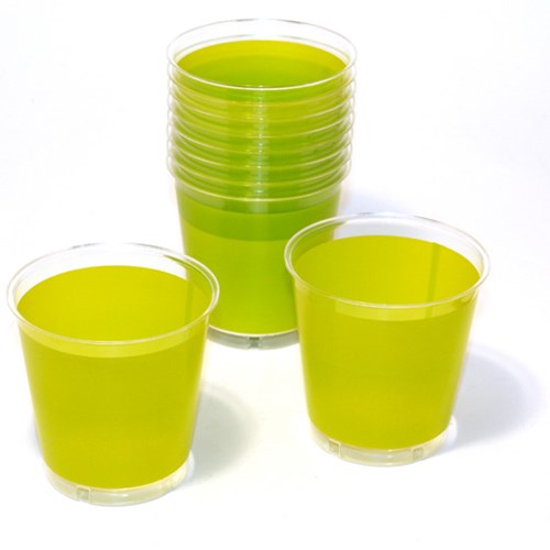 Gröna plastglas – H ca 8 cm x Ø 8 cm. Passar bra att servera olika kalla drycker i.