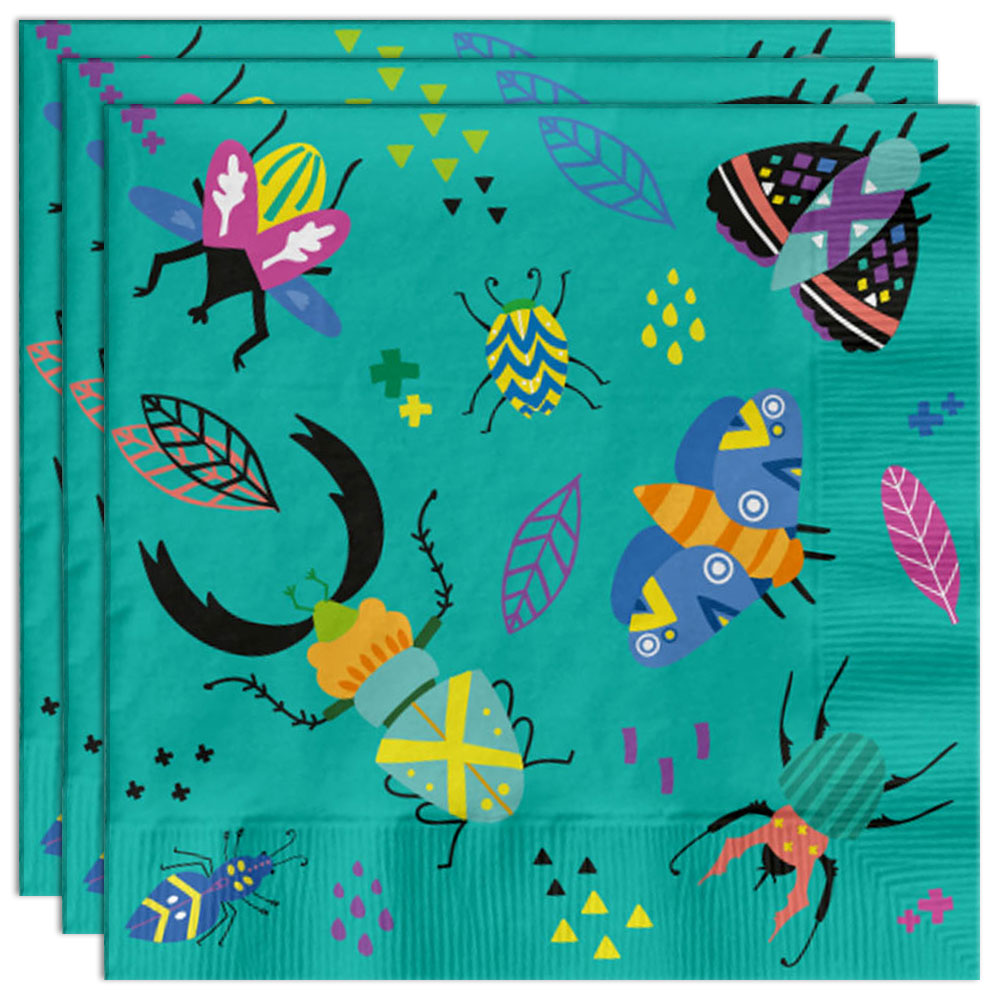 Engångsservetter Insekter 33 cm 20-pack består av tjugo gröna engångsservetter med färgglada insektsmotiv.