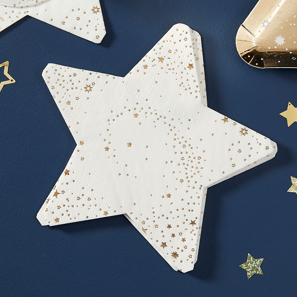 Engångsservetter Stjärna 16-pack består av sexton vita engångsservetter i form av en stjärna. Varje servett är dekorerad med skimrande guldfärgade stjärnor.