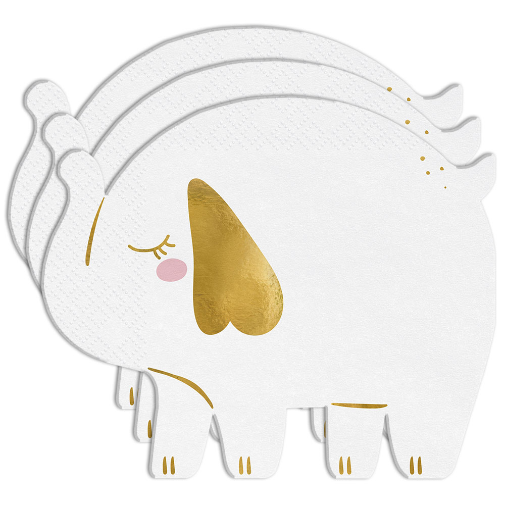Engångsservetter Vit Elefant 12-pack består av tolv engångsservetter i form av en vit elefant med guldskimrande detaljer.