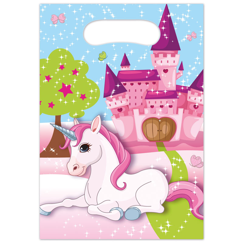 Enhörning Kalaspåsar kommer i härliga nyanser med tryck av ett slott, en enhörning, samt andra färgglada motiv. Kalaspåsarna är tillverkade av plastmaterial.