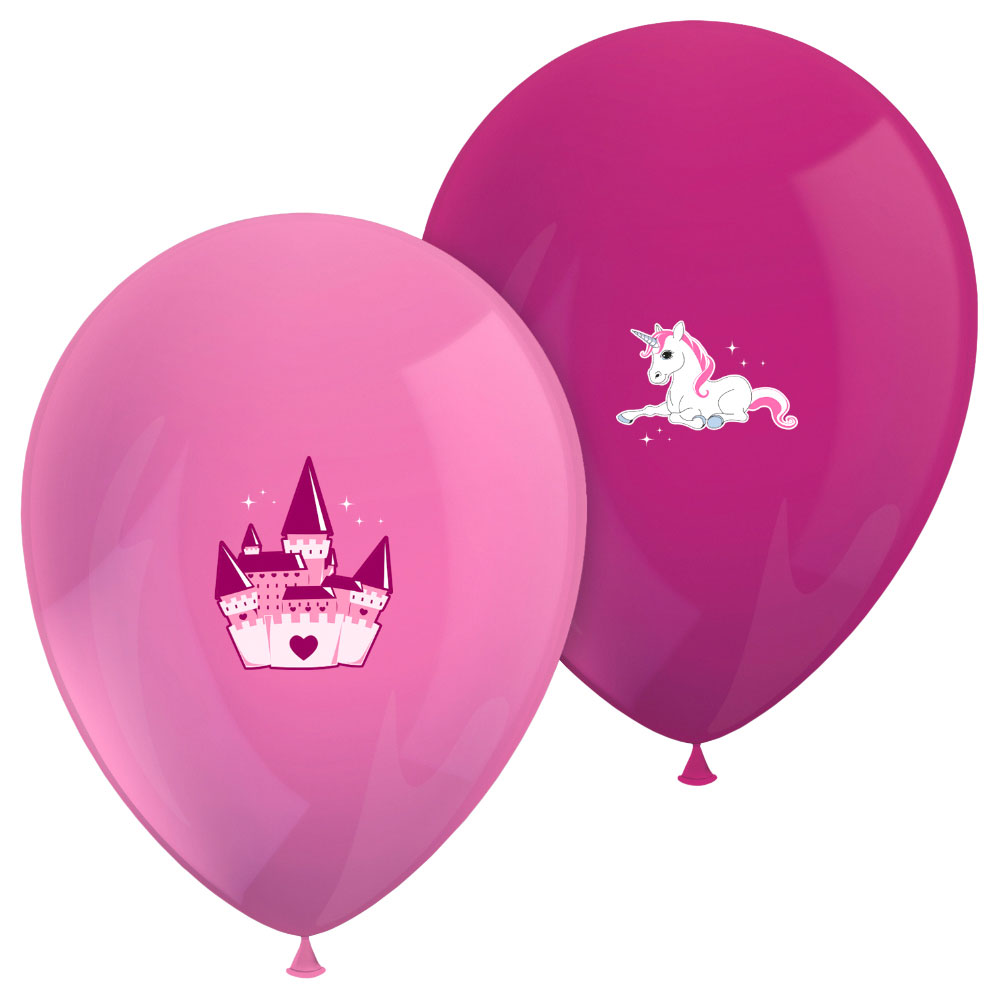 Enhörning Latexballonger omfattar ett pack med 8 stycken latexballonger i rosa och cerise med motiv av en enhörning och ett slott. Ballongerna fylls med helium eller luft och är ca 28 cm stora och rymmer ca 11 liter.