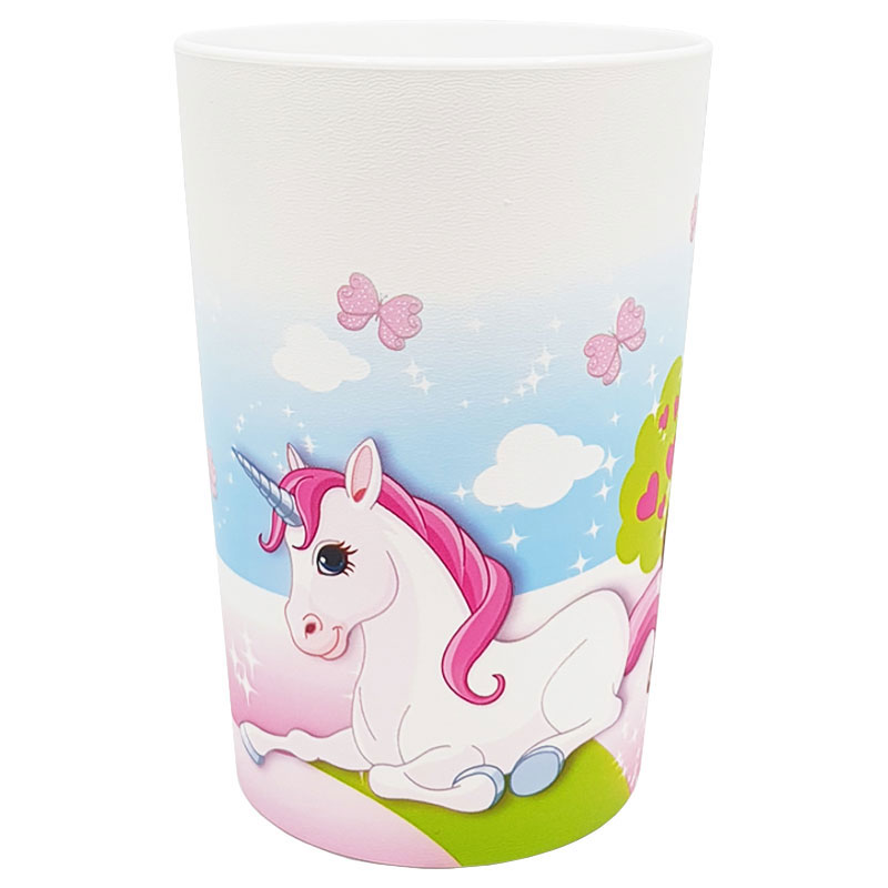 Enhörning Muggar Återanvändbara omfattar ett 2-pack flergångsmuggar i vit plast med motiv av en enhörning och ett slott i rosa, vitt, blått och grönt. Muggarna är återanvändbara och rymmer ca 230 cl och är ca 10 cm höga.