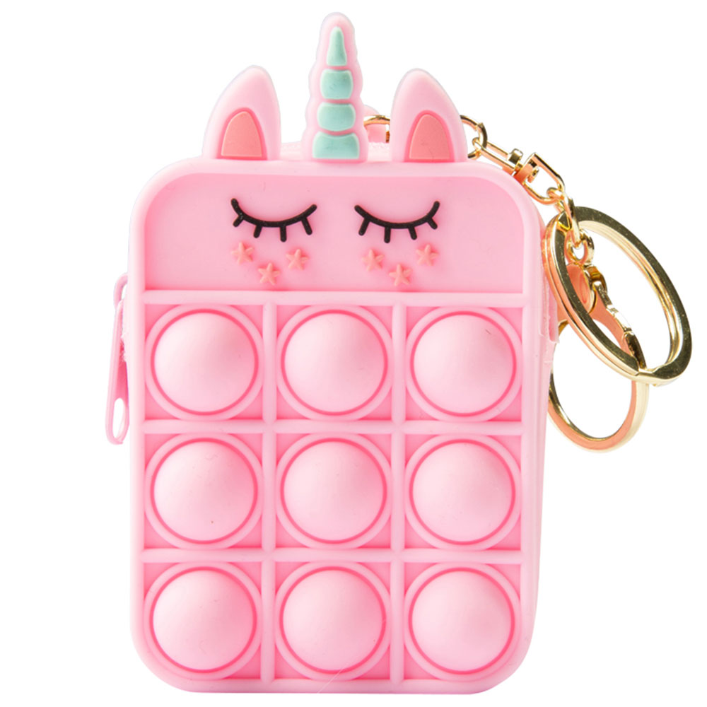 Enhörning Nyckelring med Miniväska omfattar en nyckelring i guld med en rosa miniväska med dragkedja, som ser ut som en enhörning. Den har även 9 st fidget pop it knappar på framsidan och är perfekt för att förvara veckopengen, nycklarna eller andra mindre saker.