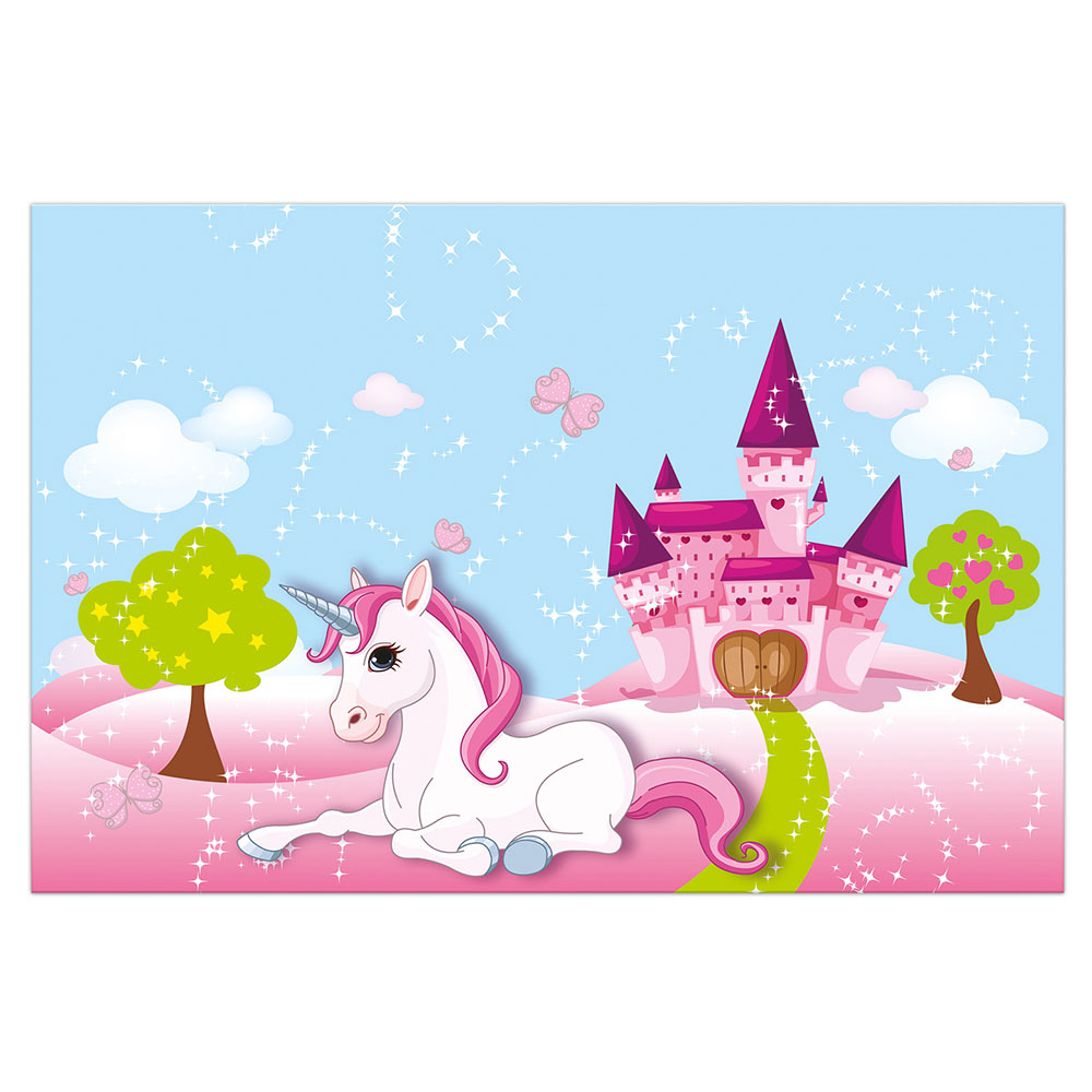 Enhörning Pappduk omfattar en 120 x 180 cm stor pappduk med motiv av en söt enhörning i ett magiskt landskap med ett slott i bakgrunden.