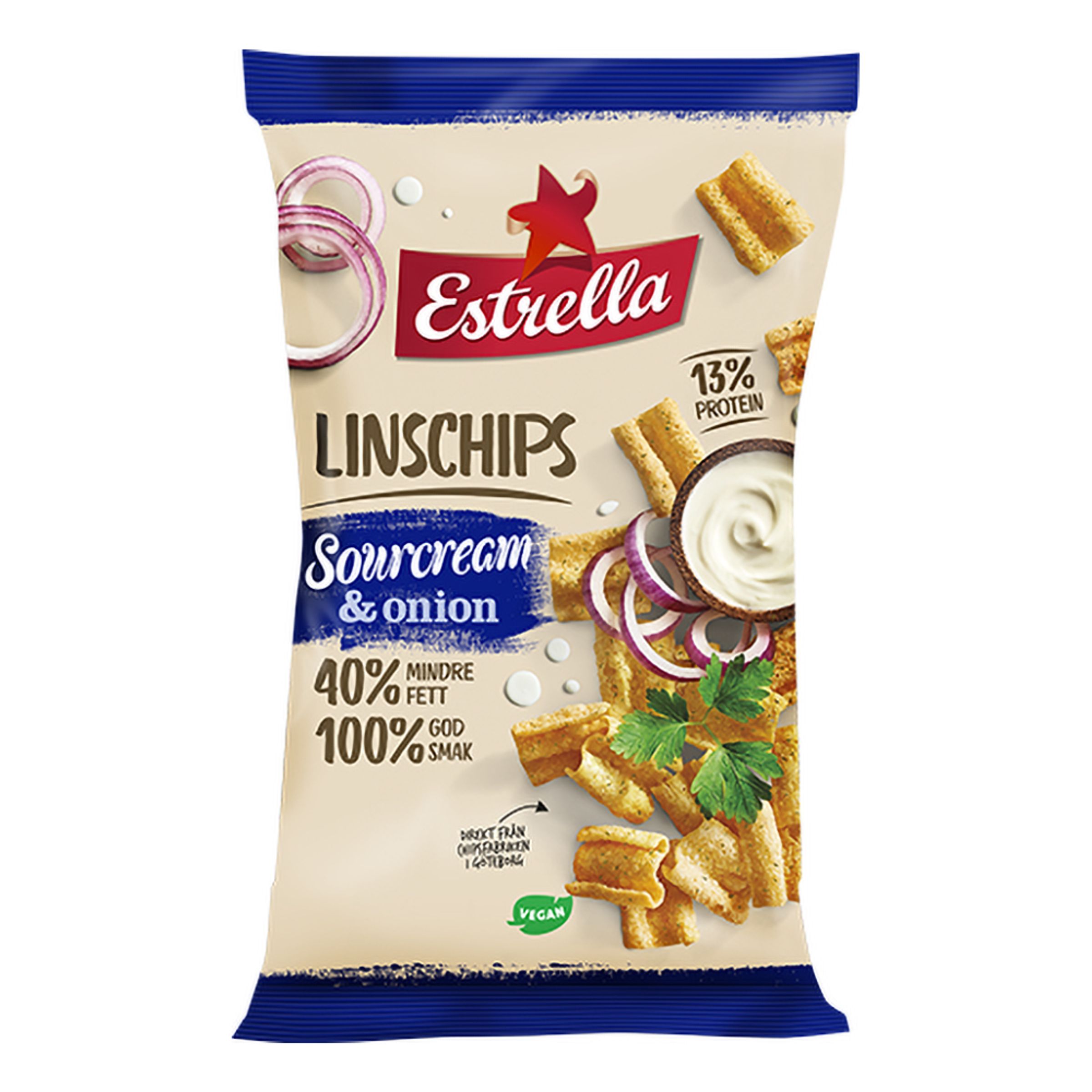 Revolutionerande chips som enligt Estrellas chipsguru har generös karaktär och perfekt konsistens, med en klassisk smak av syrlig gräddfil och lök. Chipsen är veganska, har 40% mindre fett än vanliga chips och hela 13% protein – vilket gör att chipsen i mångt och mycket är ett hälsosammare alternativ till det klassiska potatischipset!