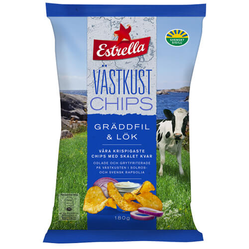 Estrellas Västkustchips Gräddfil & Lök har en naturligt ljuvlig smak av syrlig gräddfil och ett sting av lök som tillsammans med kombinationen av solros- och svensk rapsolja lyfter den fina potatisen till nya höjder. En utsökt upplevelse från bygden där land möter hav.