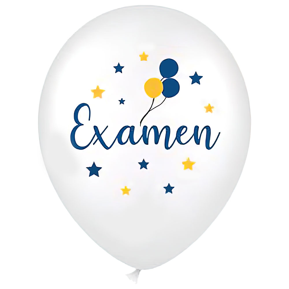 Examen Latexballonger omfattar ett 8-pack vita latexballonger med texten "Examen" samt små motiv av stjärnor och ballonger i blått. Ballongerna fylls med luft eller helium och blir ca 30 cm stora.