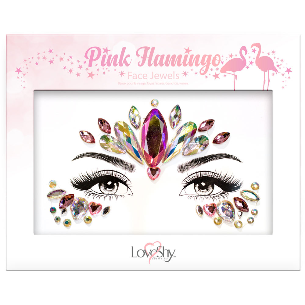 Face Jewels Pink Flamingo omfattar ett kit med rosa och silvriga ansikts diamanter i olika former och storlekar. Applicera genom att försiktigt lyfta av diamanterna från papperet, placera dem på ansiktet som på bilden eller skapa egen design.