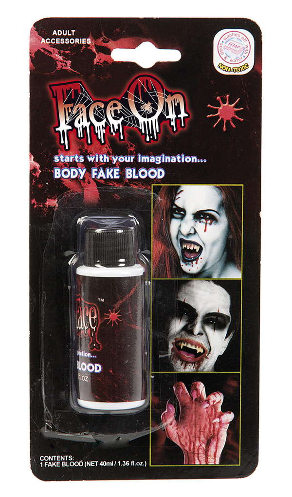 Face-On Fake Blod inkluderar en tub med realistiskt teaterblod som enkelt tvättas bort med tvål & varmt vatten.