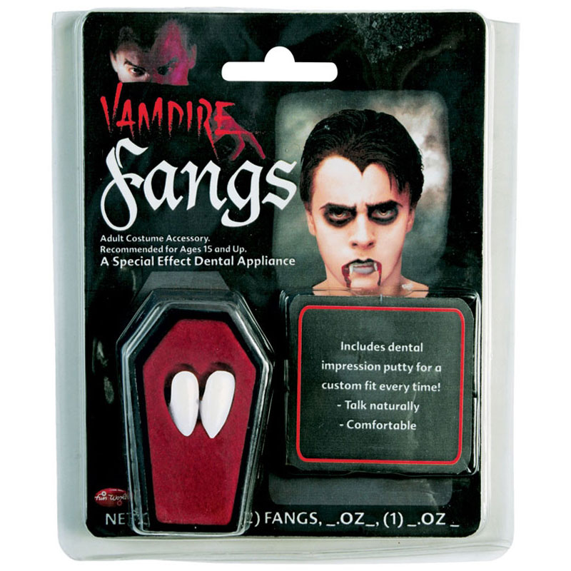 Fangs Vampyrtänder består av ett par läskiga vampyr huggtänder, samt dental lim. Instruktioner om applicering finns på förpackningen.