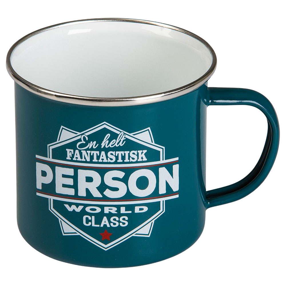 Fantastisk Person Retro Mugg omfattar en emaljerad plåt-mugg i en mörk grön-blå nyans med texterna "En Helt Fantastisk Person" och "World Class" i vitt med röda detaljer. Muggen är ca 9 x 9,5 cm stor.