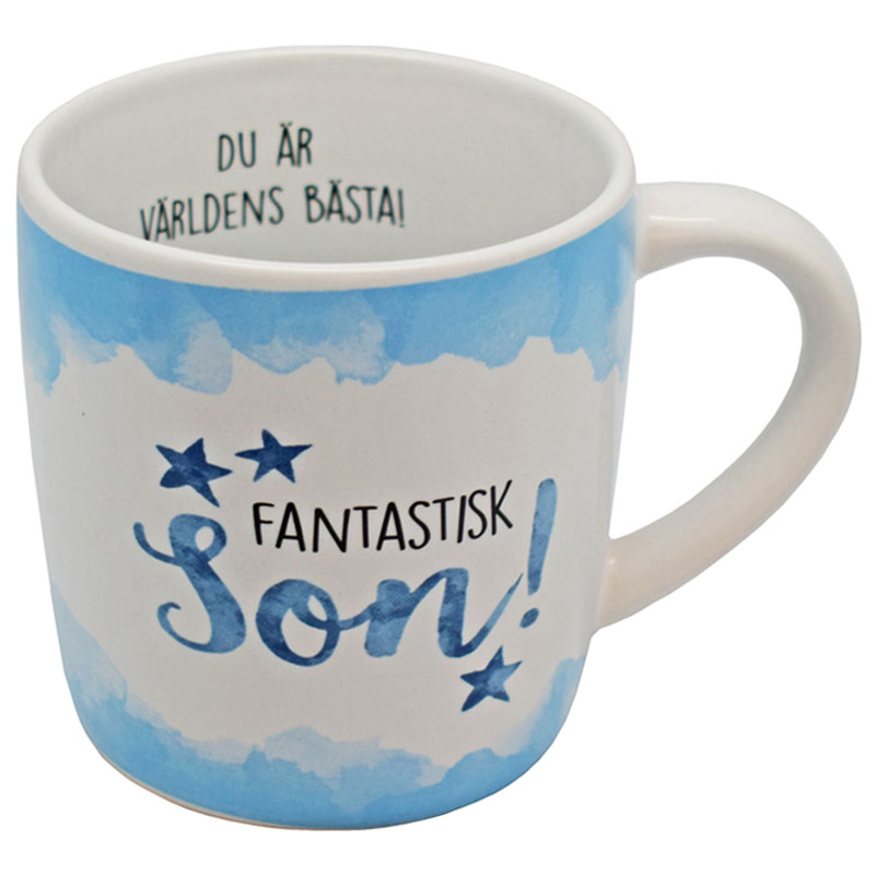 Fantastisk Son Mugg omfattar en mugg i porslin med blåa detaljer och texten "Fantastisk Son" på utsidan och "Du är världens bästa!" på insidan.