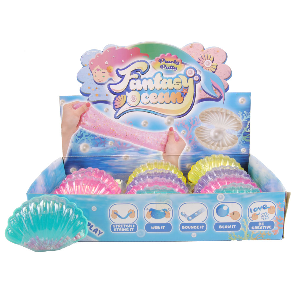 Fantasy Ocean Slime Snäcka består av en snäckformad behållare som innehåller glittrigt slime med rosa och vita pärlor. Slime snäckan finns i färgerna rosa, lila, gul och blå.