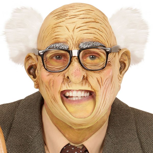 Farfar Mask med Hår och Öppen Mun omfattar en mask som liknar en gammal gubbe med två tofsar vitt hår på sidorna och ett stort hål där munnen är. Masken täcker ansiktet och toppen av huvudet.