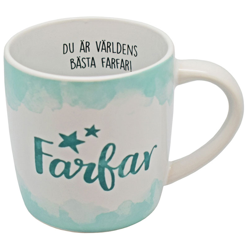 Farfar Mugg innefattar en mugg i porslin med gröna detaljer och texten "Farfar" på utsidan och "Du är världens bästa farfar" på insidan.