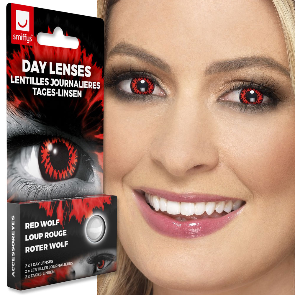 Färgade Linser Red Wolf är svarta med rött mönster över hela linsen. Linserna är hållbara i 3 månader efter att förpackningen brutits. Ett bra alternativ för dig som är ute efter ett läskigt utseende!