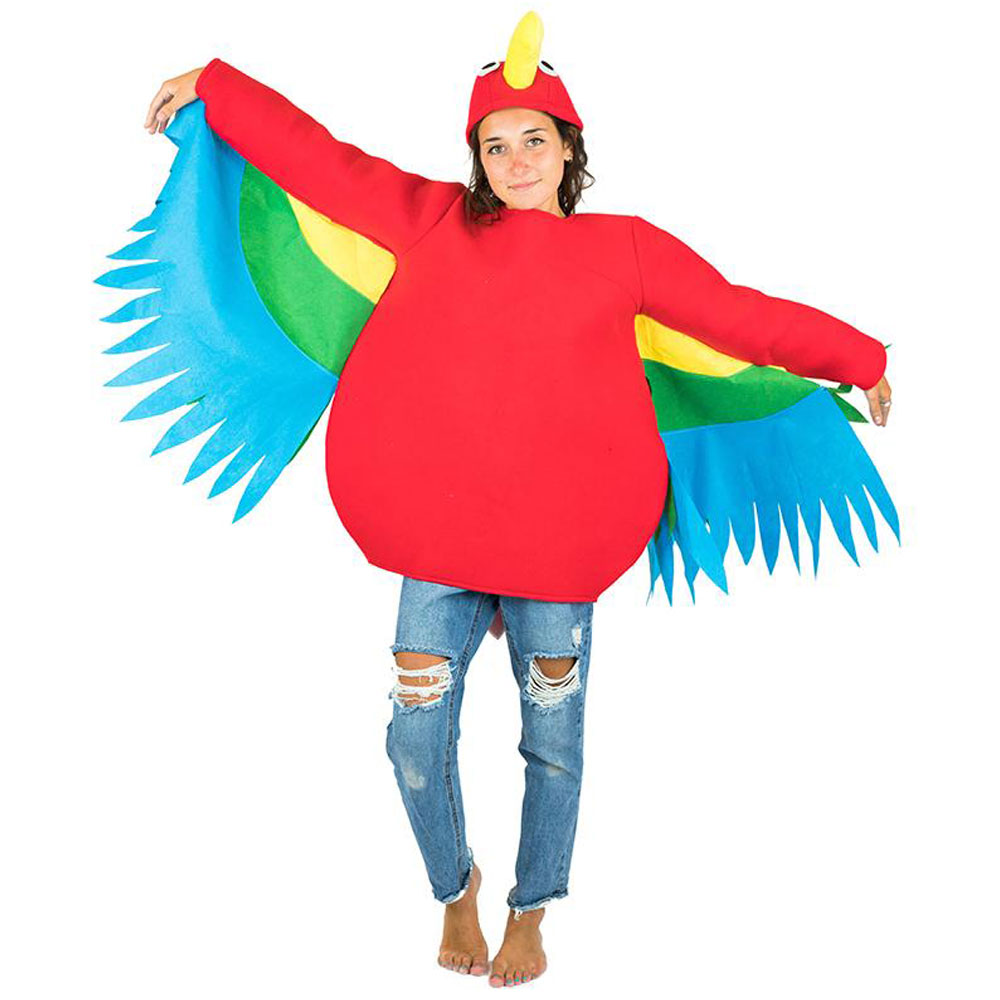 Färgglad Papegoja Maskeraddräkt innehåller en röd papegojdräkt som täcker överdelen av kroppen med hängande vingar i blått, grönt och gult på ärmarna. Ingår även en matchande röd hatt med gul näbb och svart-vita ögon på.