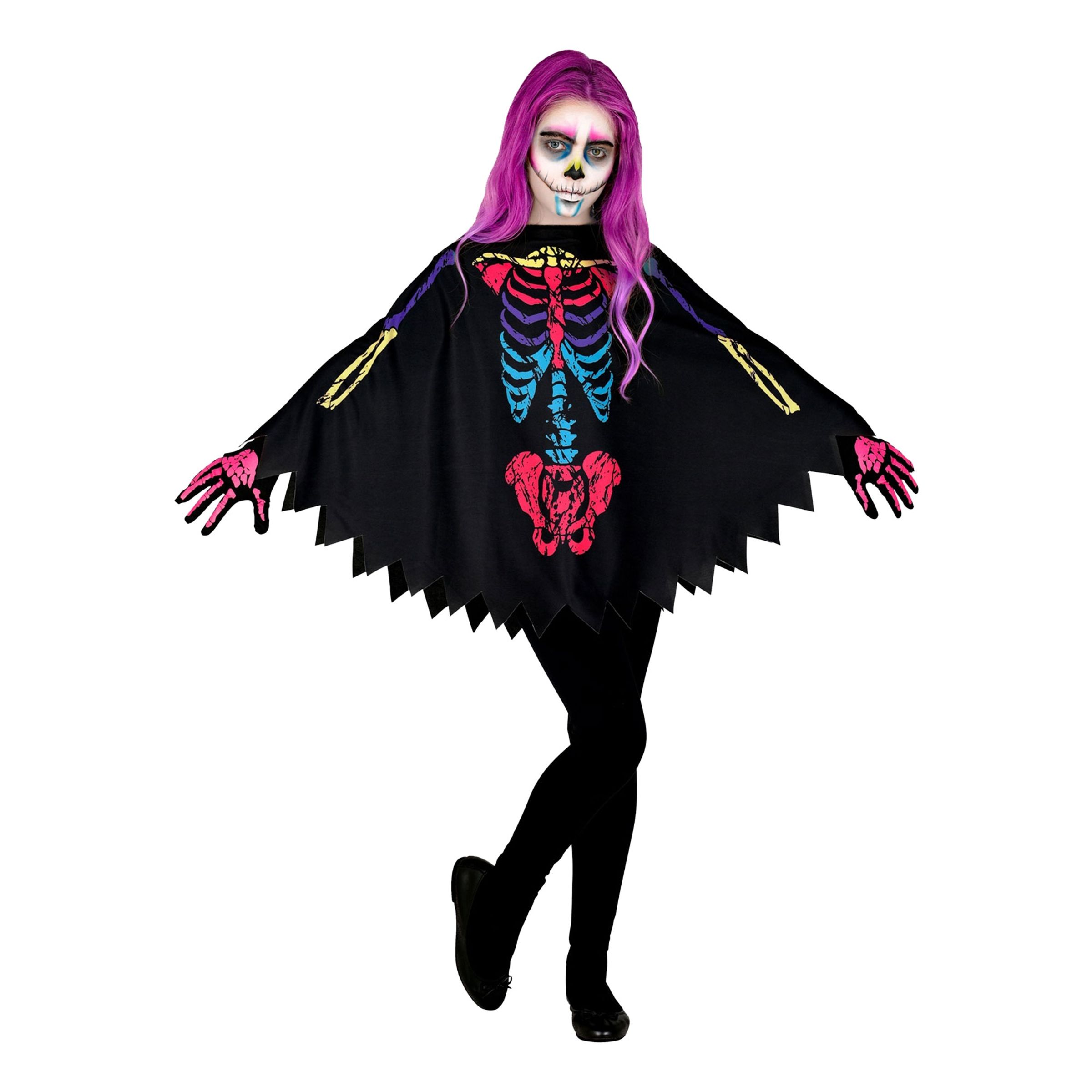 Färgglad Skelett-poncho för Barn är en svart poncho med spetsiga kanter och ett färgglatt skelett som motiv. En enkel men snygg dräkt att dra på sig på halloween!