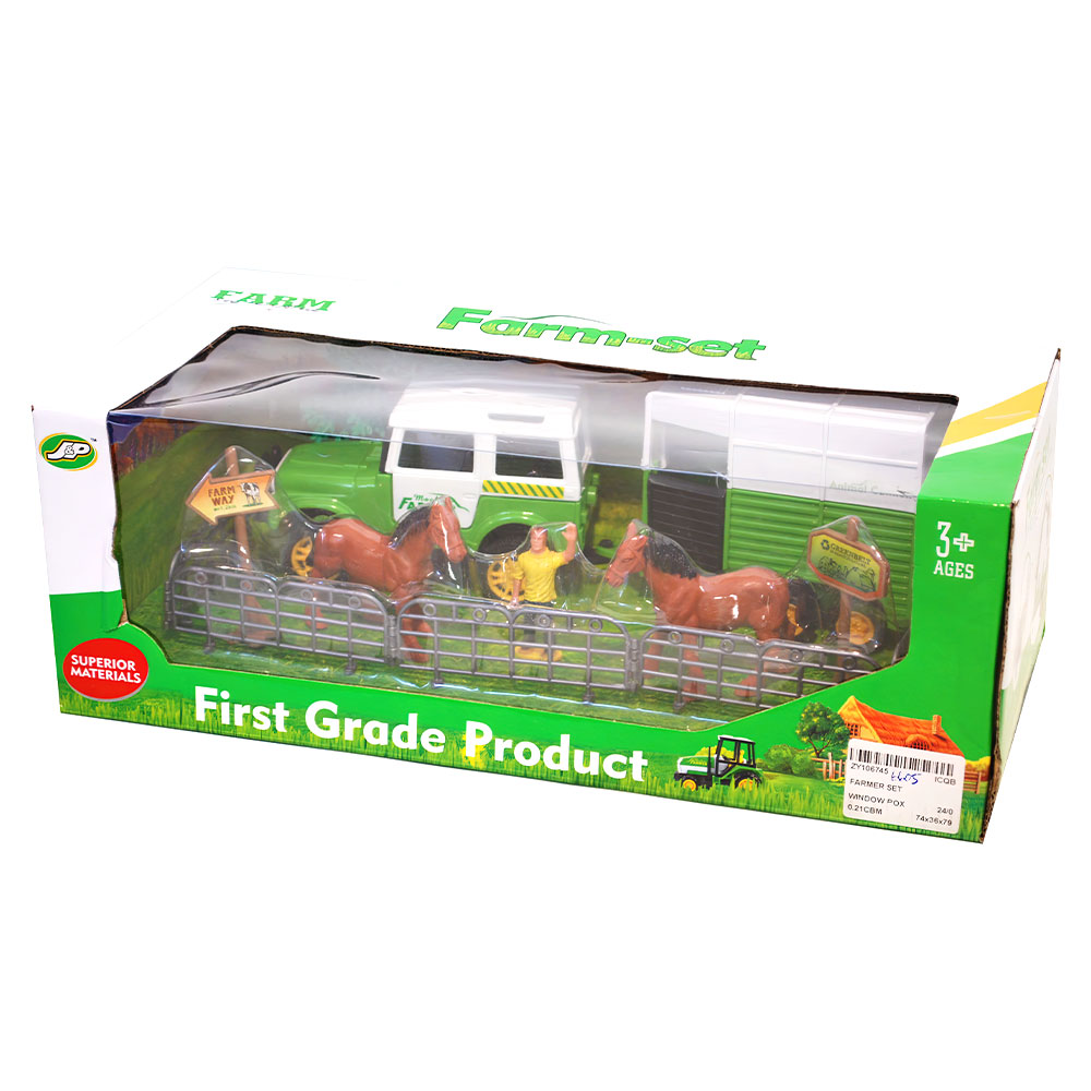 Farm Set med Bil och Hästtransport omfattar ett lekset med en bil med hästtransport, en lekfigur, två hästar, två skyltar och ett staket. Leksakerna är tillverkade av plast och passar barn över 3 år.