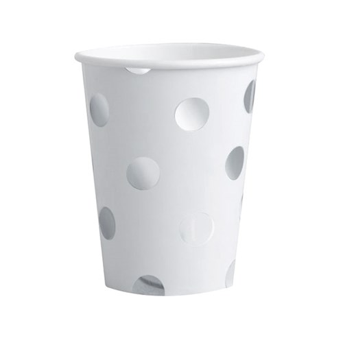Festartiklar – Prickiga, silver, Pappmuggar (8-pack)