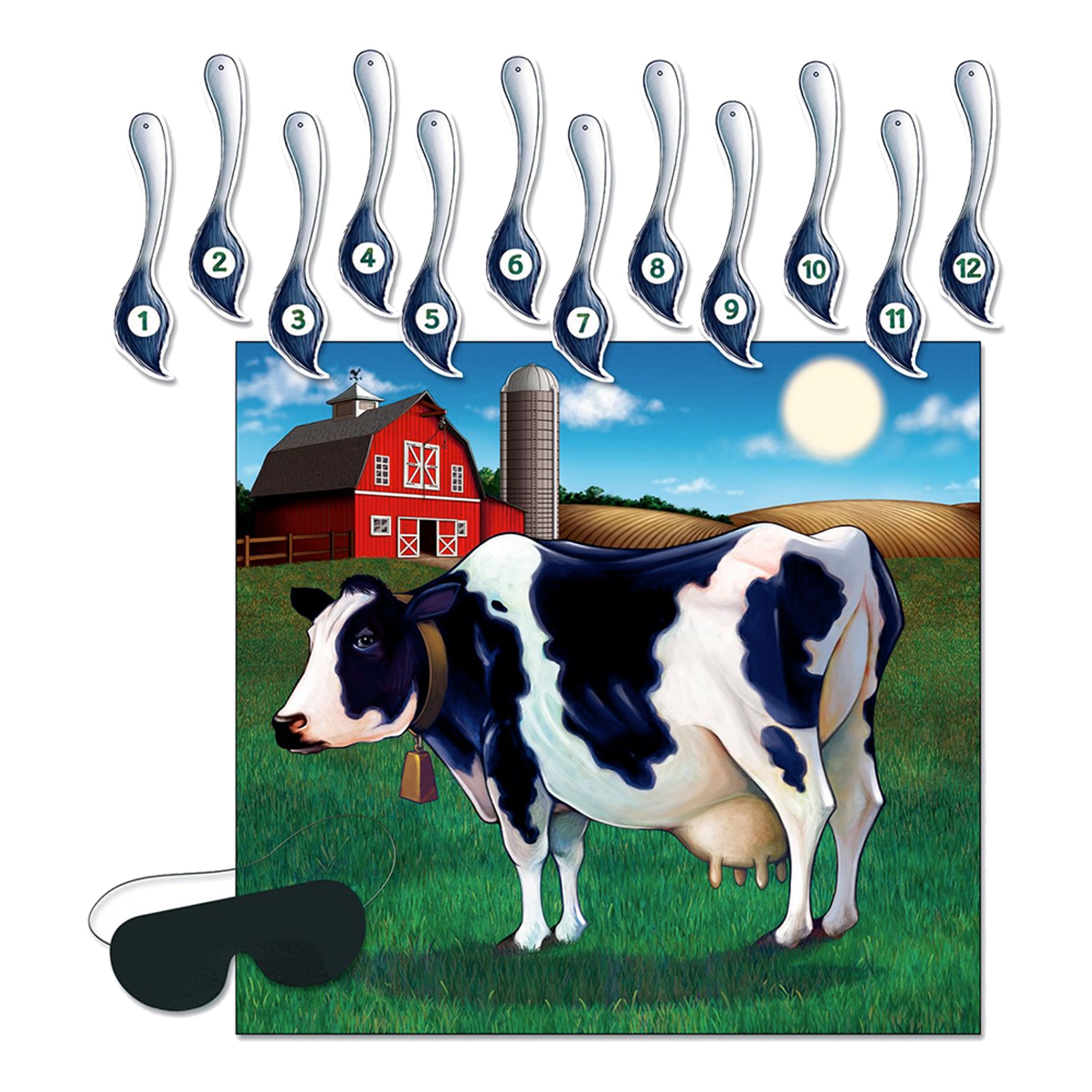 Detta är en rolig lek som kan spelas av både vuxna och barn! Sätt upp bilden på kossan på väggen. Spelet går ut på att försöka sätta svansen på kossan så nära den rätta platsen som möjligt, självklart med en ögonbindel på sig för att göra det hela betydligt svårare! Svansarna är numrerade så att det blir lätt att hålla redan på vilken svans som tillhör vem.