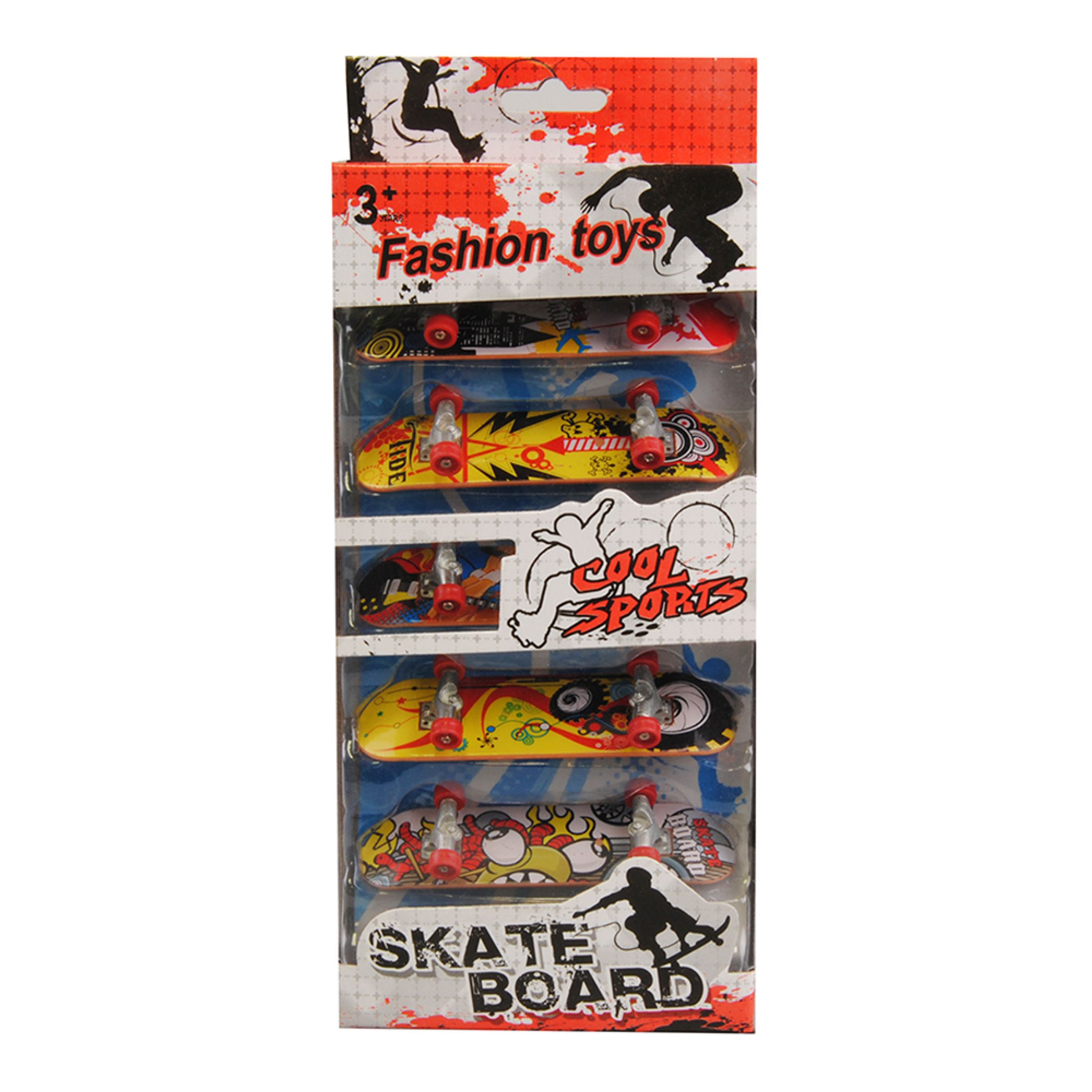 Fingerboards Set inkluderar fem stycken fingerboards som mäter ungefär 10 centimeter på längden och 2,5 centimeter på bredden. Ej lämplig för barn under 3 år. Skickas osorterat vilket innebär att färg och motiv kan variera.