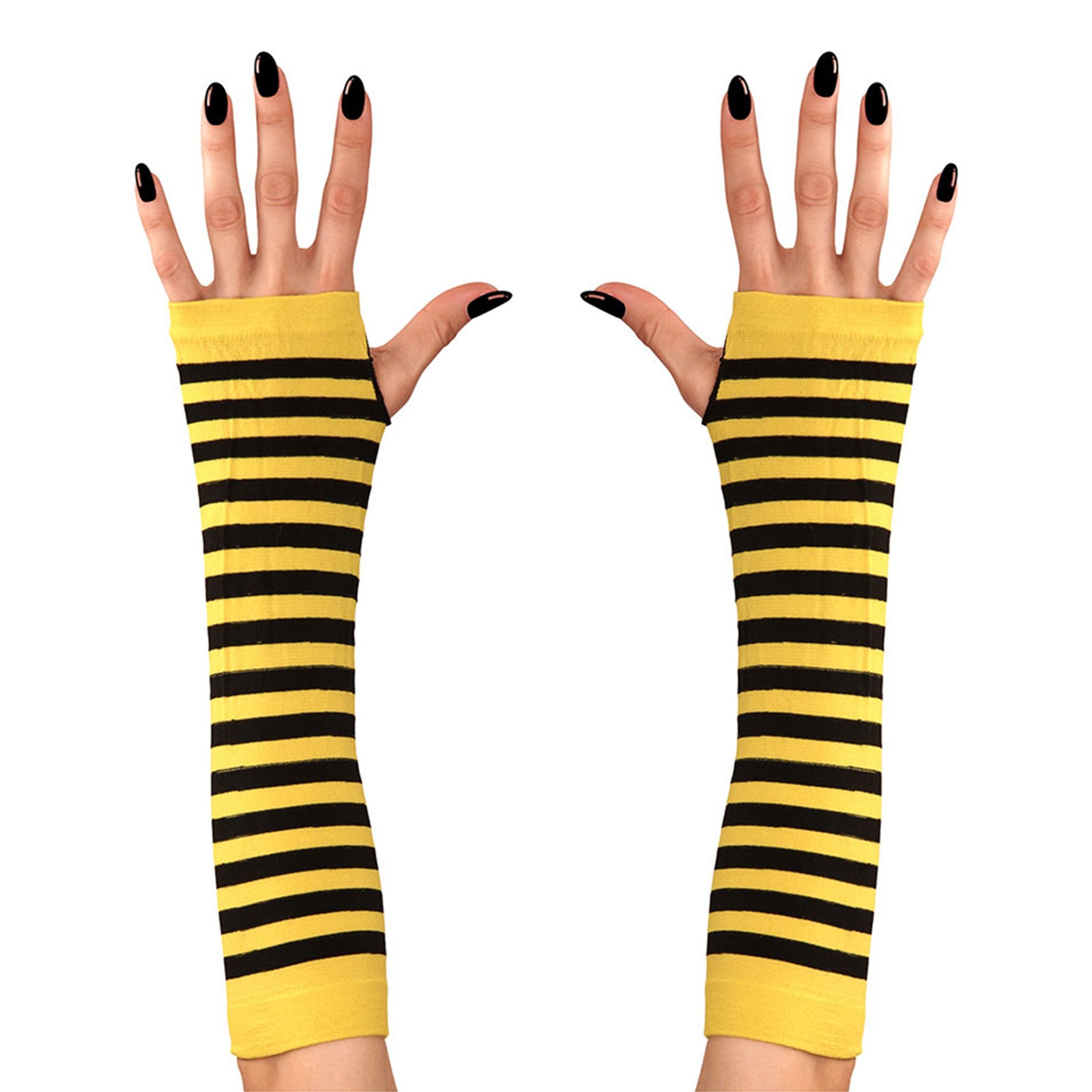 Fingerlösa Handskar Geting är ett par långa och stretchiga handskar i fingerlös modell. De är svart- och gulrandiga och passar utmärkt om du ska klä ut dig till ett bi, humla eller geting till maskeraden. Handskarna är av nylonmaterial.