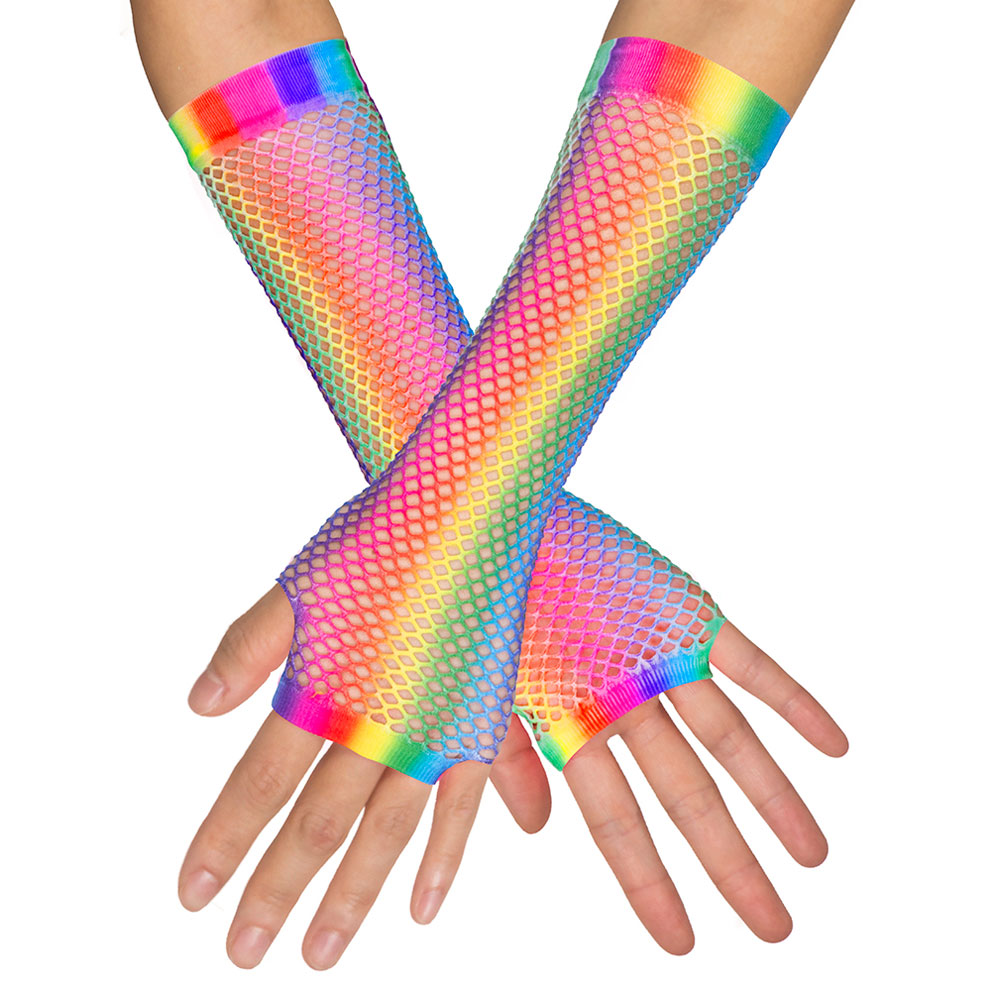Super coola fingerlösa näthandskar i fina regnbågsfärger som kan snygga till en hel del olika maskerad och fest outfits! Med dessa långa näthandskar kan du göra dig riktigt festfin på nolltid, matcha dem med något färgglatt eller låt dem bli en utstickande accessoar till en lite mer diskret outfit. Snygga handskar som passar extra bra till exempelvis maskerad, festival, pride och andra liknande tillfällen.