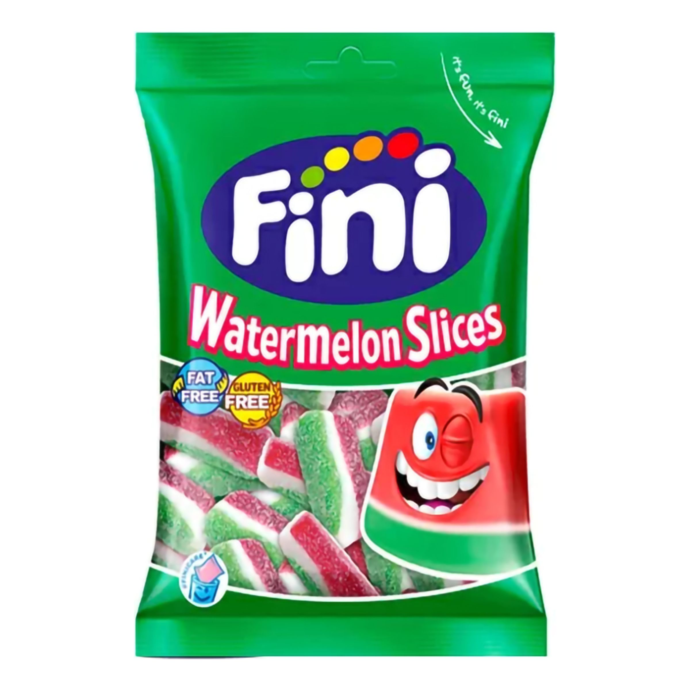 Fini Melon Bitar Påse innehåller vattenmelonsformade- och smakande gelégodisar. Levereras i påse om 75 gram.