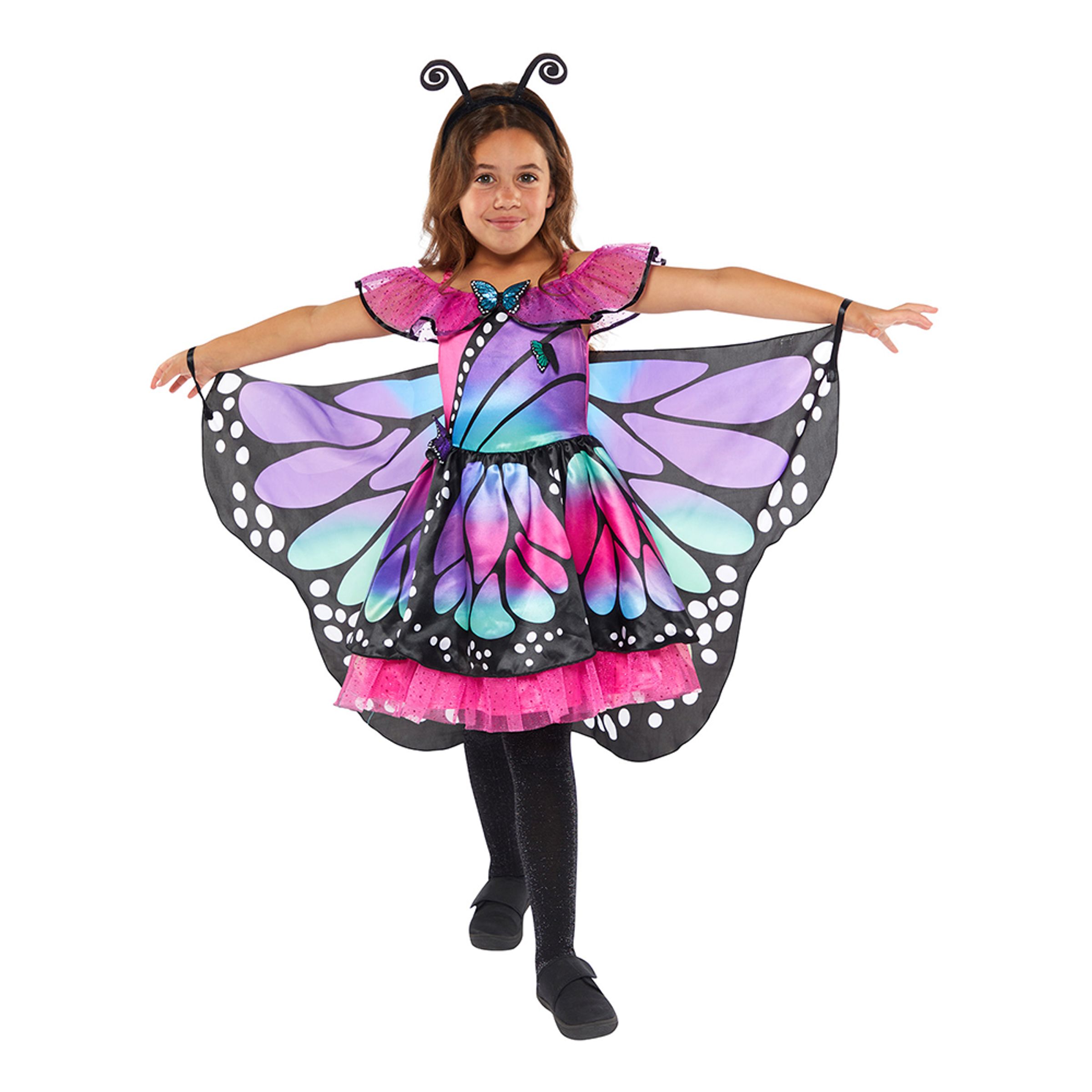 Fjäril Klänning Barn Maskeraddräkt inkluderar en flerfärgad klänning med vingar i form av en vacker cape med fästen för handlederna. Medföljer gör ett matchande diadem. Köp till strumpbyxor för en komplett outfit och komplettera gärna med smink och glitter för bästa fjärils-look!