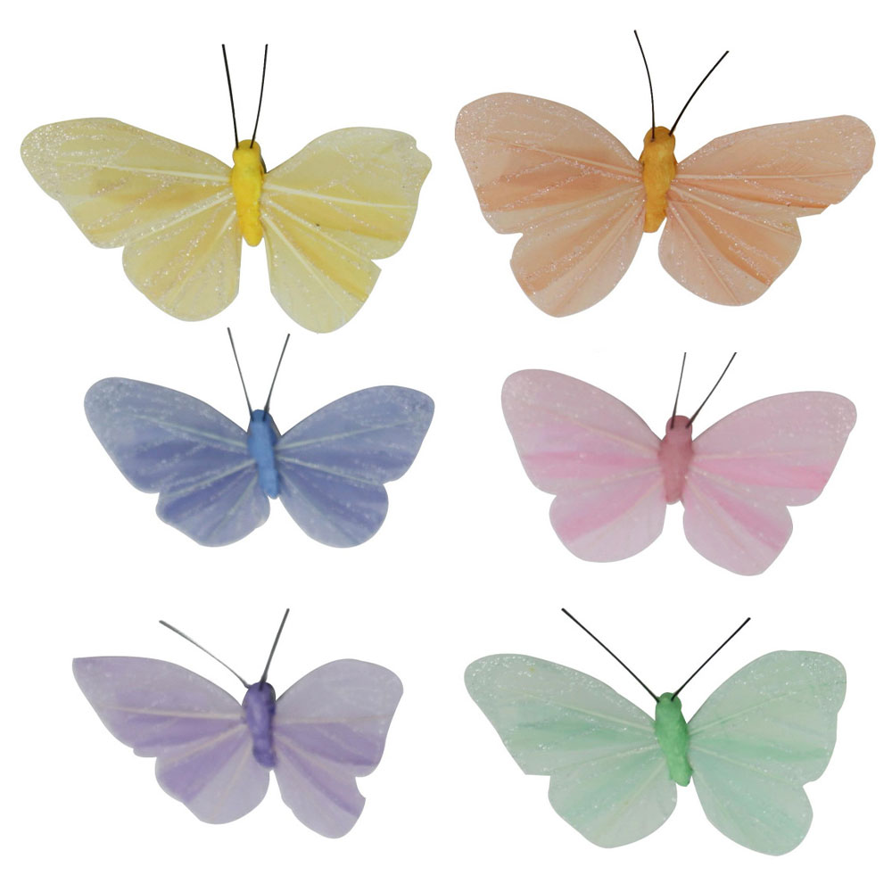 Fjärilar med Clips Pastell 6-pack består av sex glittriga fjärilar med clips i pastellnyanser av rosa, grönt, lila, blått, gult och orange.