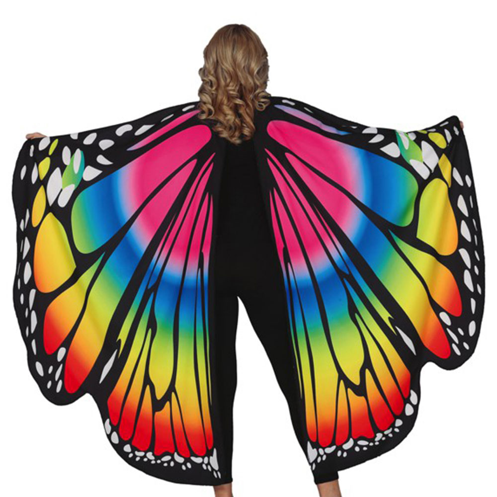 Fjärilsvingar Flerfärgade omfattar ett par flerfärgade fjärilsvingar som sätts på med hjälp av svart resårband vid axlar och fingrar.