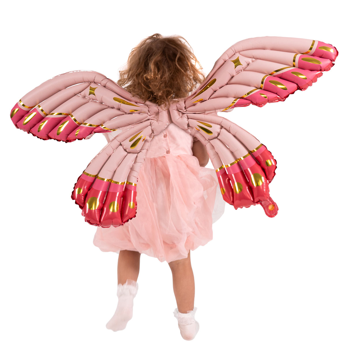 Fjärilsvingar Uppblåsbara Rosa omfattar en folieballong i form av fjärilsvingar i en matt rosa nyans med guldiga detaljer. Ballongen kan fästas på ryggen eller användas som en vanlig ballong. Medföljer sugrör för att blåsa upp folieballongen.
