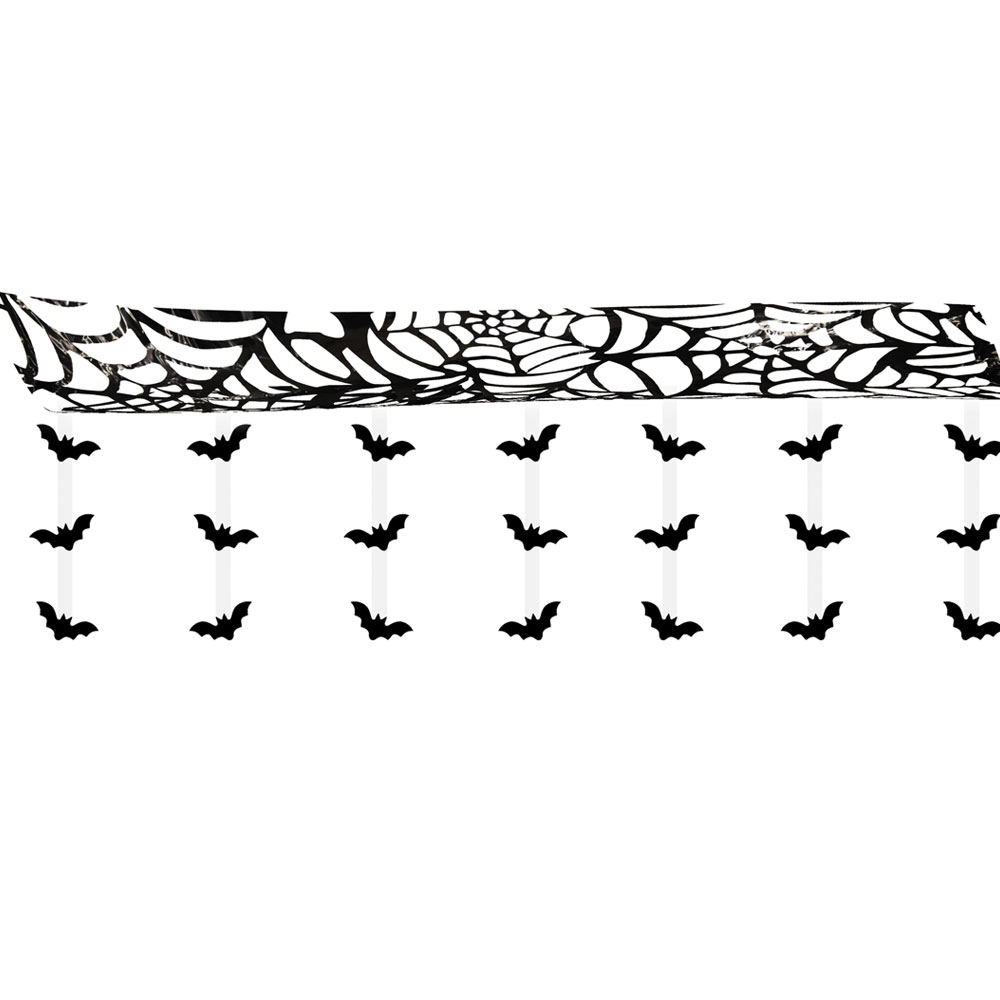 Fladdermöss Halloween Girlang består av en svart Halloween girlang som föreställer fladdermöss och ett stort spindelnät.