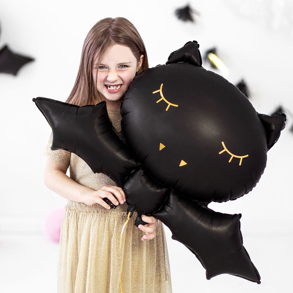 Fladdermus Ballong Folie består av en svart Halloween ballong i form av en fladdermus med utsträckta vingar, samt guldiga huggtänder och ögonfransar. Ballongen kan fyllas med luft eller helium. Tillverkad av folie.