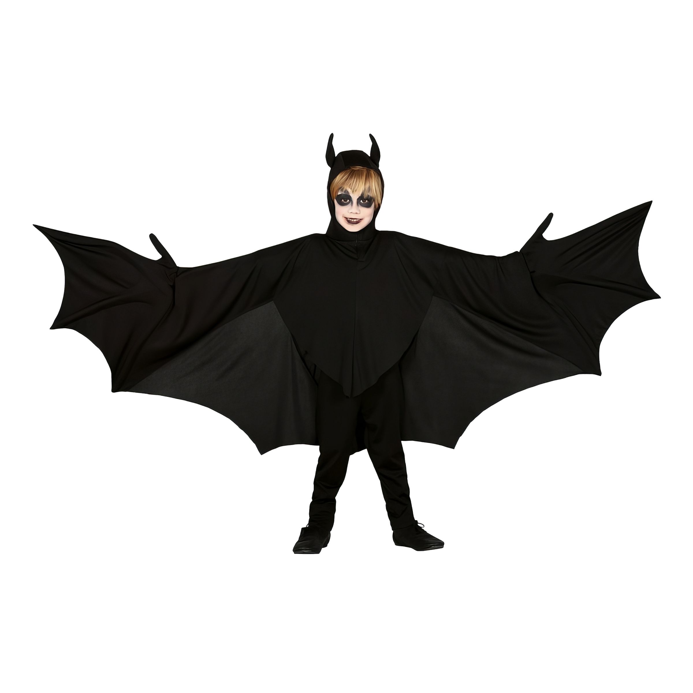 Fladdermus Barn Maskeraddräkt inkluderar en svart tunika med vingar som hänger ner när du lyfter upp armarna. Tunikan har även en huva med fladdermusöron på. Komplettera gärna med svarta byxor och en läskig sminkning för ultimat look!