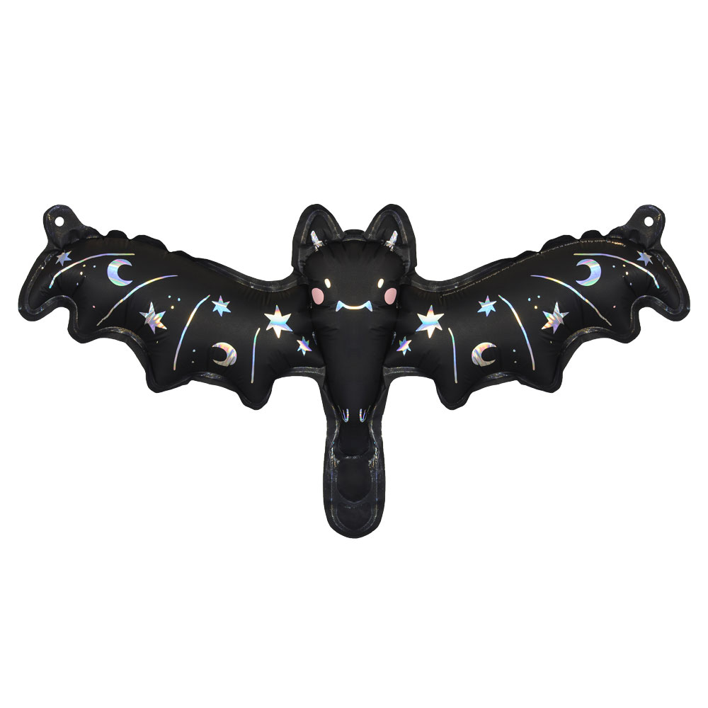 Fladdermus Folieballong Svart omfattar en folieballong i form av en svart fladdermus med holografiska motiv i form av stjärnor och halvmånar. Ballongen har varsin ögla på fladdermusens vingar vilket gör att den kan hängas upp med snöre, enskilt eller som del av en ballonggirlang. Ballongen är ca 35 x 12 cm och fylls med luft eller helium och har självförslutande ventil.