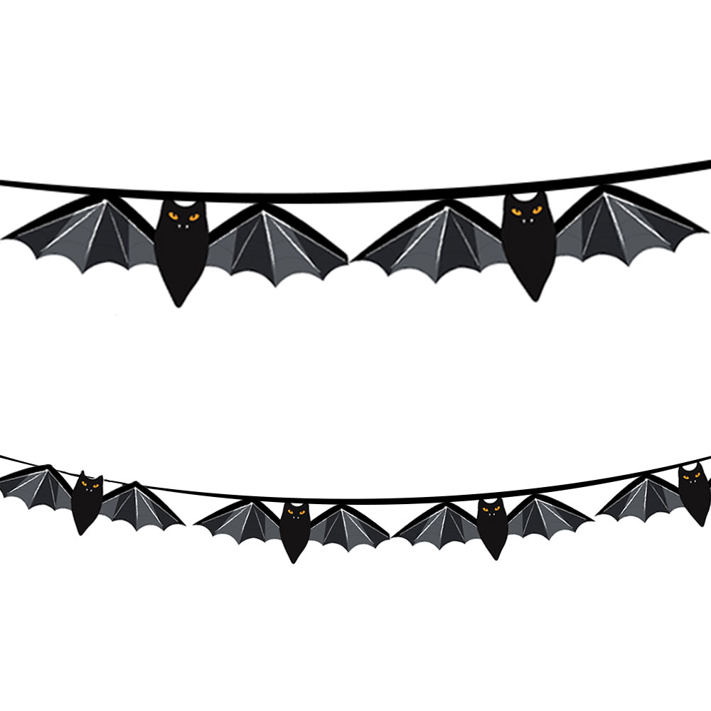 Fladdermus Girlang med Glitter omfattar en girlang med motiv av svarta och grå fladdermöss med glitterdetaljer på vingarna.