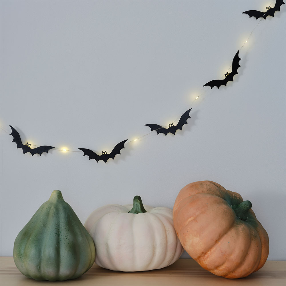 Fladdermusgirlang LED består av åtta fladdermöss i trä fästa på en 2 meter lång sladd. Fladdermössens ögon är lysande med LED-ljus drivet av två AA-batterier. (Batterier är ej inkluderade!)