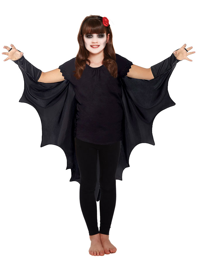Fladdermusvingar Cape Barn består av en svart mantel som föreställer ett par fladdermusvingar för barn. Manteln fästs runt halsen och armarna.