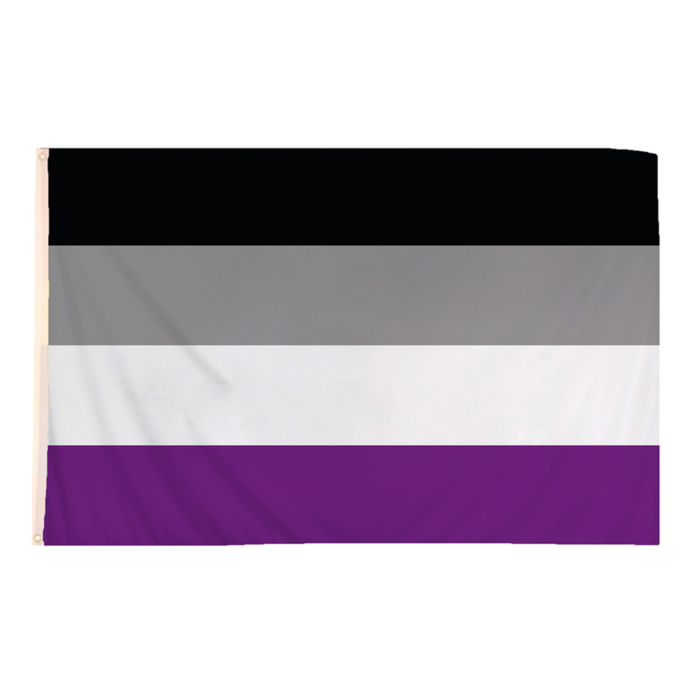 Flagga Asexuell levereras styckvis, mäter 152 x 91 cm och är tillverkad i 100% polyester. Flaggan kommer i svart, grå, vit och lila färg. Flaggan kan du fästa på exempelvis en flaggpinne eller dylikt.