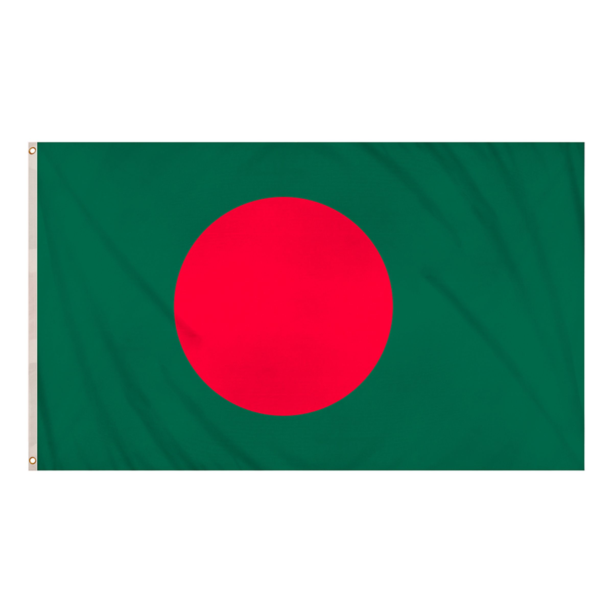 Flagga Bangladesh är en flagga med två metallringar i hörnen på ena kortsidan för enkel upphängning. Flaggan är grön med en rund röd skiva i mitten.
