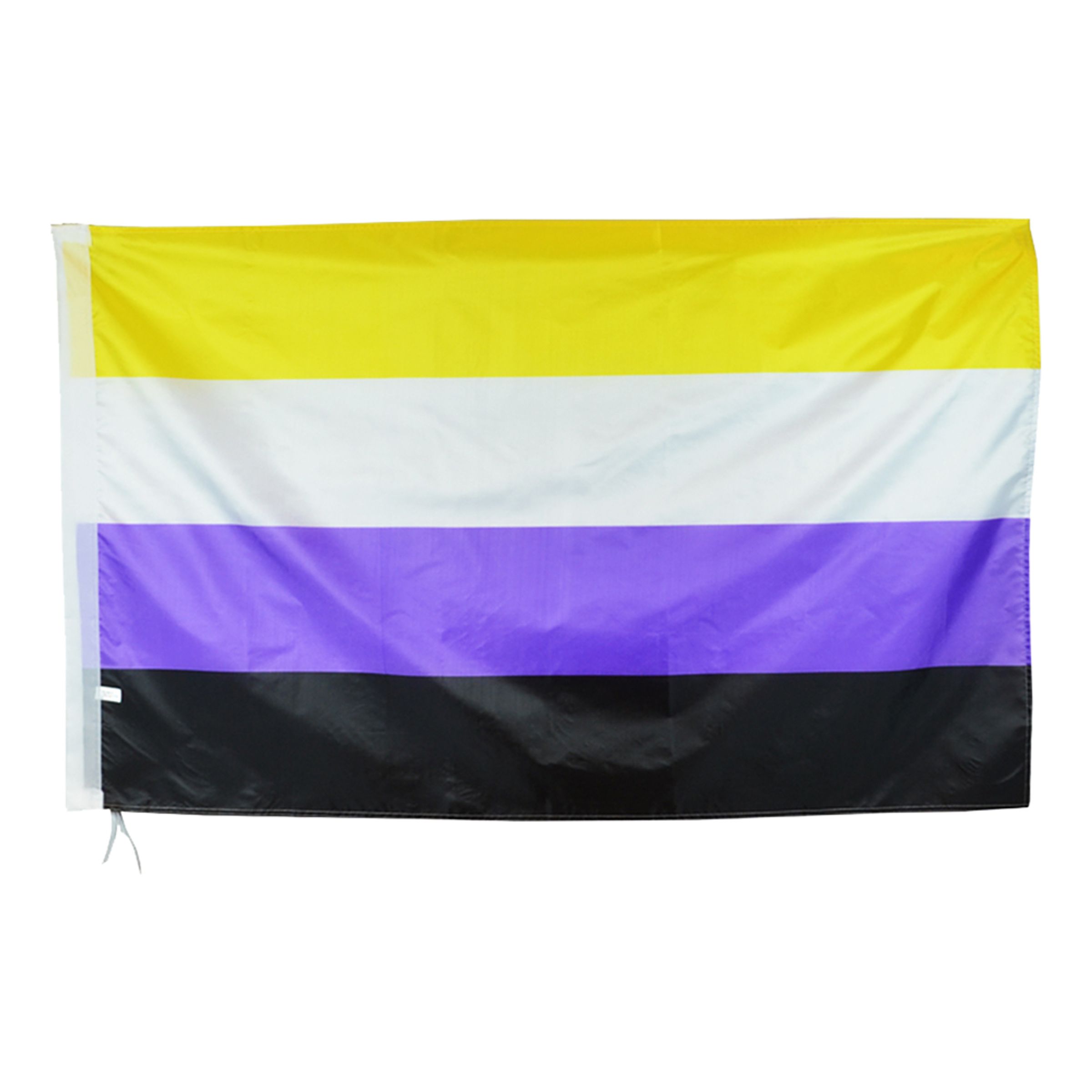 Flagga XL Pride Ickebinär funkar både som party flagga och även förberedd för att kunna använda på pinne. När man använt Ickebinära flaggan är den förberedd att kunna hängas upp på väggen.