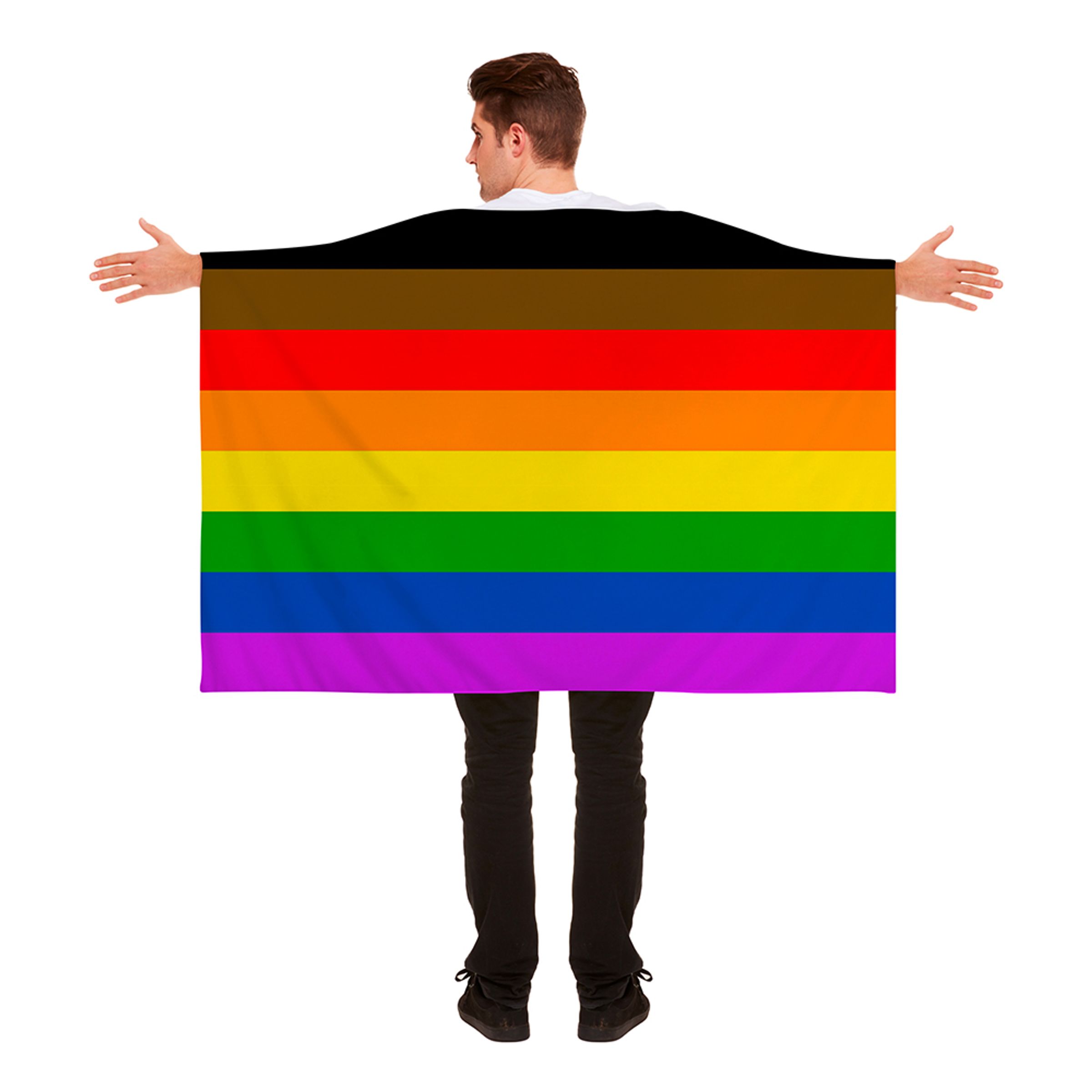 Flaggcape Pride 8 Färger kommer i färgerna lila, blå, grön, gul, orange, röd samt brun och svart som symboliserar mångfald (svart) och inklusivitet (brun).